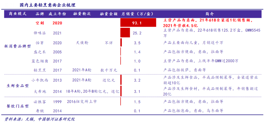 經典案例:根據天貓、中國銀行證券研究院等綜合資訊表明,空刻在行業內率先將輕烹意面推向市場,具備一定先發優勢,2021年銷售額約 5 億元,天貓官方店月銷量約 90 萬盒,處于遙遙領先位置;第二梯隊則為鋒味Π、怡芽、大希地等,天貓月銷量約 0~5 萬盒。