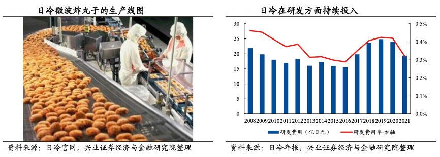 經典案例:根據日冷官網、日冷年報、興業證券經濟與金融研究院等綜合資訊表明,日冷核心競爭力在于“研發及技術創新”,這奠定爆品基礎。其率先推出了“微波預制菜”及“三段式炒飯”,研發團隊由 100 多人組成。同時其市調后發現消費者認為鮮炸丸子味道最佳,但油炸過程繁瑣,于是公司抓住該需求痛點,技術方面突破了微波后水分的蒸發也不影響丸子酥脆口感的壁壘,于 1994 年推出微波炸牛肉丸,廣受市場好評。