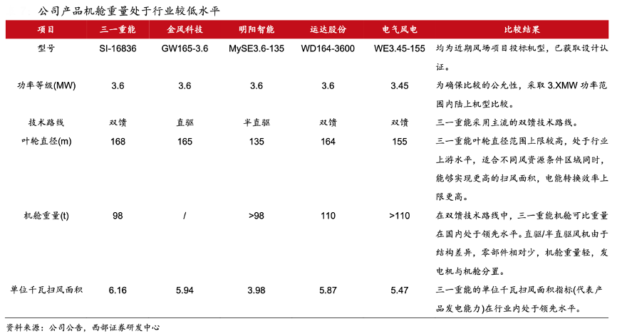 經典案例:根據公司公告、西部證券研發中心等綜合資訊表明,三一重能公司在風電機組結構件輕量化設計方面具備顯著優勢。與同行業 3.XMW 功率機型對比,公司產品機艙重量處于同行業中較低水平,同時公司產品葉輪直徑、單位千瓦掃風面積行業領先。