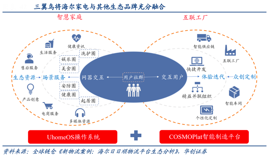 經(jīng)典案例:根據(jù)全球鏈倉(cāng)《新物流案例:海爾日日順物流平臺(tái)生態(tài)分析》、華創(chuàng)證券等綜合資訊表明,三翼鳥生態(tài)以海爾家電為基礎(chǔ)不斷延伸拓展,借助卡奧斯平臺(tái)賦能提高生產(chǎn)供應(yīng)商效率,UhomeOS系統(tǒng)為智慧家庭提供操作接口,高端品牌卡薩帝提供套系產(chǎn)品,最終通過(guò)日日順物流的高效送裝實(shí)現(xiàn)場(chǎng)景生態(tài)落地。