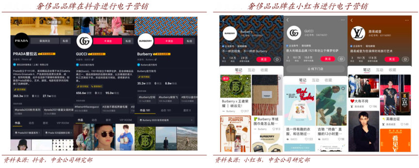 經典案例:根據抖音、小紅書、中金公司研究部等綜合資訊表明,數字化渠道來看,奢侈品牌在中國仍主要依賴自營的 brand.com 進行線上銷售,而社交網 絡平臺諸如抖音、微信、小紅書等主要用于觸達消費群體和市場營銷(“種草”),之后將由社交平臺導流至品牌官網。