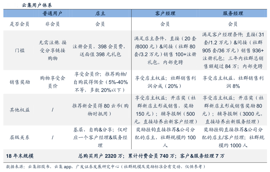 經典案例:根據云集招股書、云集app、廣發證券發展研究中心等綜合資訊表明,除普通購買用戶外,云集會員體系分為三級:即店主→客戶經理→服務經理,且平臺規定每位店主僅唯一 對應一位客戶經理和服務經理。
