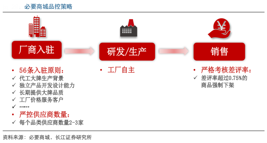 經典案例:根據必要商城、長江證券研究所等綜合資訊表明,入駐必要商城需要滿足 56 條標準,“有代工大牌的生產制造背景”、“擁有獨立 產品開發設計能力”、“有長期提供大牌品質的恒心”和“有工廠價格服務用戶的思維”等條件突出。同時,公司嚴格控制每個品類的供應商數量不超過 2-3 家,給廠商提供壟斷垂直品類市場的機會,以此降低競爭壓力,而廠商也無需投放流量廣告、參與促銷等活動,從而使廠商能更專注做好產品。