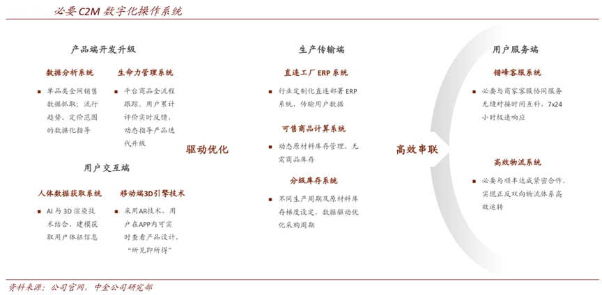 經典案例:根據公司官網、中金公司研究部等綜合資訊表明,必要打造了一整套面向產品端、用戶端以及生產端的 C2M 底層操作系統,通過數據化編譯消費者需求直連生產,改造制造商能力矩陣并優化消費者體驗。
