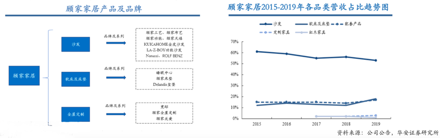 經(jīng)典案例:根據(jù)公司公告、華安證券研究所等綜合資訊表明,顧家家居是軟體家具行業(yè)龍頭,創(chuàng)立40載為全球家庭提供健康、舒適、環(huán)保的客廳及臥室家居產(chǎn)品,公司品類擴(kuò)張之路順暢,沙發(fā)的營業(yè)收入占比從2015年的61%下降至 2019年的53%,而軟床及床墊的營收占比從2015年的12%提升至2019年的18%。配套產(chǎn)品2019年的營收占比也達(dá)到 17%。