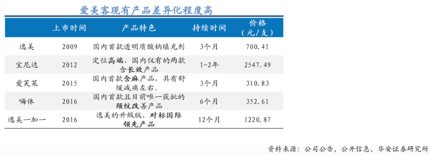 經(jīng)典案例:根據(jù)公司公告、公開信息和華安證券研究所等綜合資訊表明,愛美客專注于玻尿酸產(chǎn)品生產(chǎn),其目前共有6款玻尿酸系列產(chǎn)品在售,產(chǎn)品差異化程度較高,嗨體作為目前國內(nèi)唯 一獲批的頸紋改善產(chǎn)品,考慮到牌照獲批時(shí)間,預(yù)計(jì)未來5年內(nèi)公司能夠獨(dú)占這一細(xì)分賽道。