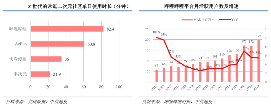 典型現象:根據艾瑞數據、中信建投等綜合資訊表明,Z 世代最常逛的二次元社區為 B 站,單日使用時長可達82.4 分鐘。其自 2017 年一季度以來單季度活躍用戶增速不低于 25%,尤其是今年以來嗶哩嗶哩前三季度活躍用戶數增長率分別為 70%、55%和 54%。B 站在去年采取付費先看策略使去年的付費大會員數增長 51 倍。