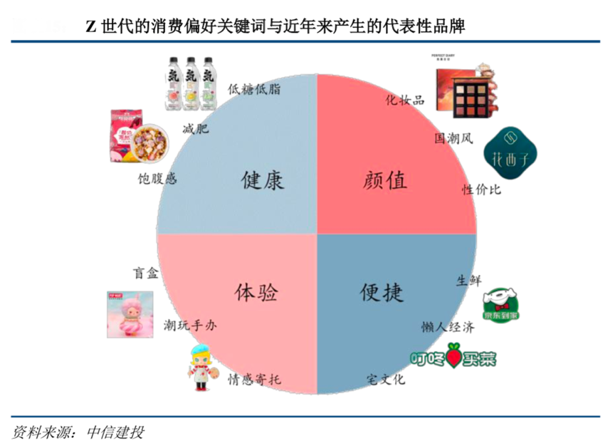 典型現象:根據中信建投等綜合資訊表明,目前 Z 世代人群處于學生或剛進入職場,自身消費能力有限,從消費品類額度的比例來看,剛性需求的物質消費占比較大,如美食就餐、服裝配飾、食品雜貨。其他品類中,精神消費(旅游、 讀書、玩游戲)的比例最高,其次是社交消費(戀愛、聚會和贈送禮品等)。Z 世代的消費理念從基礎的衣食住行需求向顏值、體驗、健康、便捷等多樣化的消費需求演變。