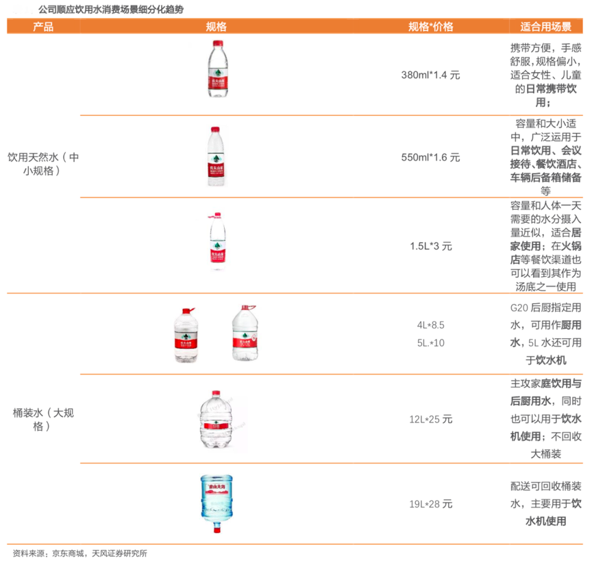 經典案例:根據京東商城、天風證券研究所等綜合資訊表明,隨著居民健康意識的逐漸增強以及對高生活品質的追求,廚用水、日飲水等家庭場景用水質量得到越來越多消費者的關注;農夫山泉順應飲用水消費場景細分化趨勢,產品涵蓋了各種380ml、550ml、1500ml、4L、5L、12L、19L等多種規格,家用消費、商用消費及小規格攜帶消費等多種消費場景基本已經涵蓋,“產品全消費場景價值”突出。