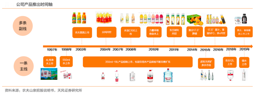 經典案例:根據農夫山泉招股說明書、天風證券研究所等綜合資訊表明,2012 年-2019年,農夫山泉連續八年保持中國包裝飲用水市場占有率第一,以2019 年零售額計,農夫山泉在茶飲料、功能飲料及果汁飲料的市場份額均居中國市場前三位,其已經形成多元化產品矩陣,除飲用水外,已經布局即飲茶、功能飲料、果汁、植物蛋白、咖啡類等多品類成長矩陣。