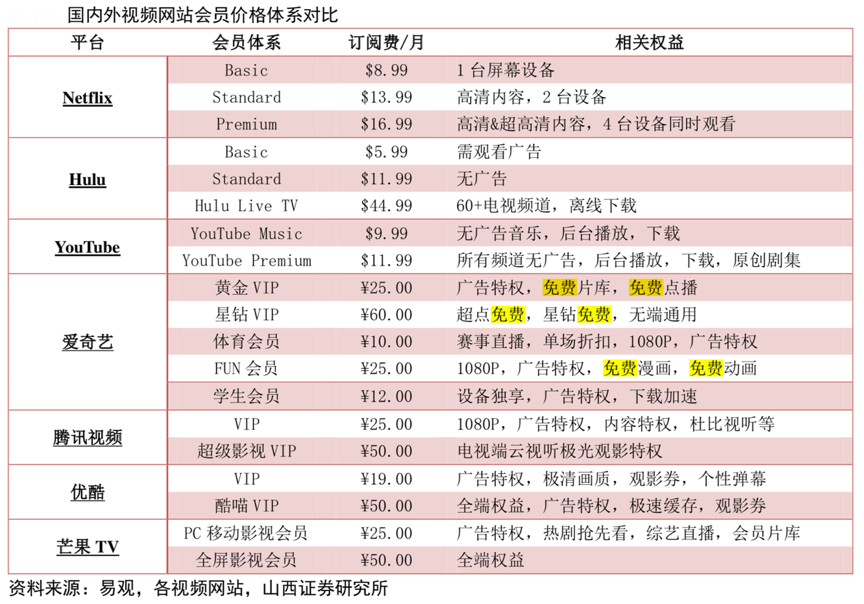 經(jīng)典案例:根據(jù)易觀、各視頻網(wǎng)站、山西證券研究所等綜合資訊表明,國內(nèi)外視頻網(wǎng)站平臺的價(jià)格策略分為針對C 端用戶 及 B 端內(nèi)容制作方兩個(gè)維度,其中 C 端用戶方面會員提價(jià)的通道已經(jīng)開啟,原因在于付費(fèi)市場經(jīng)過長期培育已經(jīng)形成較為穩(wěn)定的付費(fèi)群體,會員結(jié)構(gòu)向更高等級遷移側(cè)面反映出用戶粘性及付費(fèi)意愿,用戶群體價(jià)格彈性降低能夠?yàn)槠脚_提價(jià)奠定基礎(chǔ)。