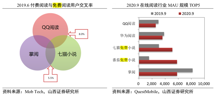 經(jīng)典案例:根據(jù)Mob Tech、QuestMobile、山西證券研究所等綜合資訊表明,目前市場上頭部的免費(fèi)閱讀 產(chǎn)品背后均有流量平臺加持,通過一定的拉新模式吸引用戶登錄并以廣告模式進(jìn)行變現(xiàn)成長迅速, 其中以番茄免費(fèi)小說為代表的,在字節(jié)系流量與廣告變現(xiàn)系統(tǒng)、智能算法的加持下,番茄免費(fèi)小說 MAU 規(guī)模從 2020 年初 1700 萬增加至 9 月 5815 萬,躍居免費(fèi)閱讀 APP 用戶規(guī)模第一。