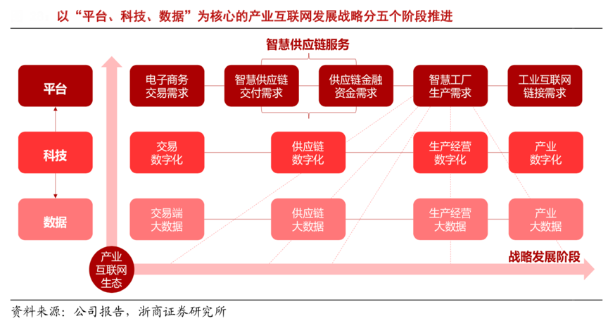 經典案例:根據公司報告、浙商證券研究所等綜合資訊表明,國聯股份確定了以“平臺、科技、數據”為核心的產業互聯網發展戰略,將按五個階段依次推進戰略:1工業電子商務階段,將滿足企業客戶的交易需求;2智慧供應鏈階段,將滿足企業客戶的交付需求;3供應鏈金融階段,將滿足企業客 戶的資金需求;4智慧工廠解決方案階段,將滿足企業客戶的生產需求;5工業互聯網階段,將上下游共構鏈接,形成產業數字化閉環。