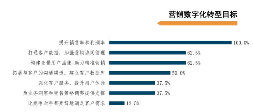 經典案例:根據《清華大學全球產業研究院-中國企業數字化轉型研究報告》等綜合資訊表明,企業營銷數字化的目標主要集中在提升銷售率和利潤率、打通客戶數據、加強營銷協同管理、構建全景用戶畫像、助力精準營銷等方面。數字化時代,更多企業,尤其是面向個人消費者的制造業企業將營銷的中心轉移到如何與消費者建立更高頻的互動,讓消費者作為主體更多地參與到營銷價值的創造中來。同時,部分企業也更加重視通過營銷數字化為業務洞察和銷售策略調整提供支撐。