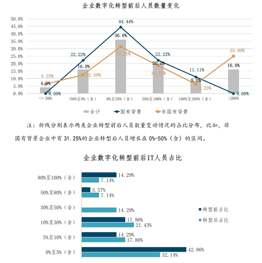 經典案例:根據《清華大學全球產業研究院-中國企業數字化轉型研究報告》等綜合資訊表明,為推動數字化轉型項目實施落地,企業紛紛打造由 IT 部門和業務部門組成的數字化轉型團隊,在轉型前后人員數量變化方面,國有企業和非國有企業的變化趨勢基本一致。參評的國有背景企業中沒有出現轉型后人員增長超過 2 倍的情況,而有 25%的非國有背景企業轉型后人員增長超過 2 倍。