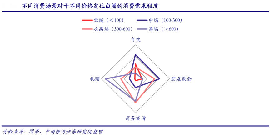 經(jīng)典案例:根據(jù)網(wǎng)易、中國銀河證券研究院等綜合資訊表明,朋友聚會中尚以中端和次高端為主,但在白酒的主要消費場景 商務(wù)宴請和禮贈中,高端產(chǎn)品才是消費者的首選。根據(jù)馬斯洛需求層次理論,當前白酒消費更多的是匹配人們的社交需求以及自我尊重、自我實現(xiàn)需求,價格定位偏高的中高端白酒產(chǎn)品更適合商務(wù)宴請或是禮贈等場合,體現(xiàn)參與主體的形象 身份等。