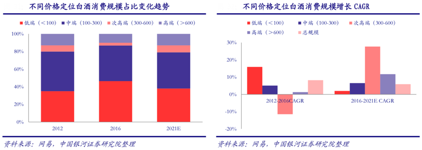 經(jīng)典案例:根據(jù)網(wǎng)易、中國銀河證券研究院等綜合資訊表明,從不同價格帶白酒未來的發(fā)展?jié)摿砜矗叨撕痛胃叨水a(chǎn)品將成為行業(yè)的增長主力。受
