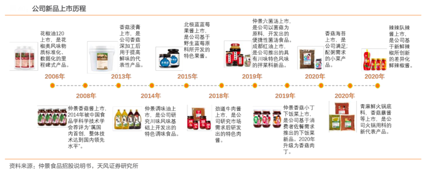經典案例:根據仲景食品招股說明書、天風證券研究所等綜合資訊表明,自成立以來,仲景食品就不斷推陳出新,幾乎每年都會推出不同品類或風味的新品,緊隨市場潮流,滿足不同客戶的需求。2006 年,花椒油 120 上市;2008 年,仲景香菇醬上市。2018-2019 年,其陸續推出牛肉醬、香菇小丁、藍莓醬、成都紅油等調味食品,市場反響良好,形成了新的利潤增長點。