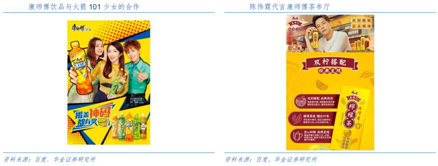 經典案例:根據百度、華金證券等綜合資訊表明,康師傅一方面通過新營銷方式鞏固核心大單品,包括新口味、IP 合作、促銷等。另一方面向中高價飲品進軍,2019 年 6 月推出名為“茶參廳”檸檬茶,主打“雙檸搭配 正點港味”,突出港式的經典檸檬茶風味,通過當紅明星陳偉霆代言,設計不同規格,獲得消費者的青睞。