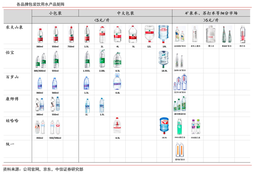 經典案例:根據公司官網、京東、中信證券研究部等綜合資訊表明,農夫山泉在包裝飲用水布局上兼具廣度和深度,一方面在包裝規模的設計上 SKU 最寬、最密,覆蓋各個消費場景;另一方面推出差異化產品(嬰兒水和鋰水)和高端化產品(天然礦泉水的運動蓋裝和玻璃瓶),并布局成長較快的細分賽道并持續深耕選中的品類,享受行業發展紅利。