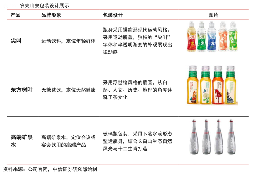 經典案例:根據益普索調研顯示,83% 的消費者愿意購買包裝新穎獨特的產品。根據公司官網、中信證券研究部等綜合資訊表明,農夫山泉包裝設計緊密結合產品定位。以尖叫為例,運動飲料尖叫于 2003 年推出,其定位年輕群體。落實到包裝上:其瓶身采用螺旋形設計并使 用運動瓶蓋,傾倒不易灑出,適用于運動情景。“尖叫”所采用的獨特字體以及半透明漸變包裝展現運動感。