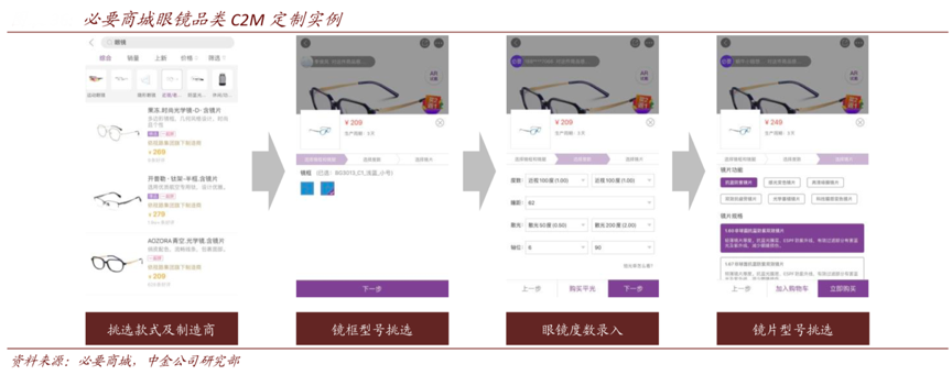 經典案例:根據必要商城、中金公司研究部等綜合資訊表明,客戶在必要商城選擇好鏡片、鏡框并錄入眼鏡度數后,制造商會 接受訂單進行生產并直接發貨,一般的生產周期為 3 天,完全繞過了中間環節且基本上消除了成品庫存問題。必要認為眼鏡這一商品的本質不是高端的光學設備,而應該是日常可選的配飾,并且通過 C2M 對生產價值的鏈的改造,實現了眼鏡的平價化、高性價比化,