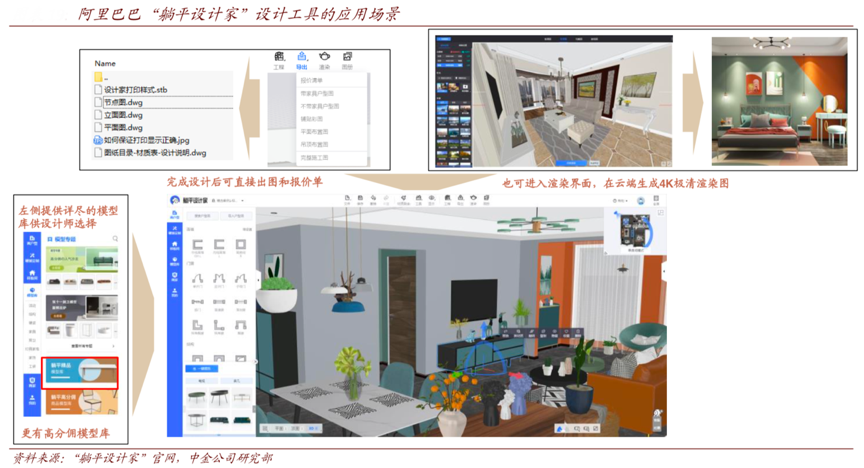 經典案例:根據“躺平設計家”官網、中金公司研究部等綜合資訊表明,2019 年 9 月,阿里巴巴 5 億元戰略投資三維家,由三維家賦能“躺平”平臺。阿里巴巴“躺平”平臺的目標是為品牌提供更加優秀的制造能力和營銷能力、讓品牌的設計成為由設計師和消費者驅動的 C2M 式設計。于設計師,“躺平”希望為設計師提供優秀的設計工具、免費的渲染服務、成熟的分傭體系和完整的供應鏈。設計師將能夠在“躺平”的設計后臺 看到制造商的工藝能力,保證設計可以直接成為產品,“所見即所得”。