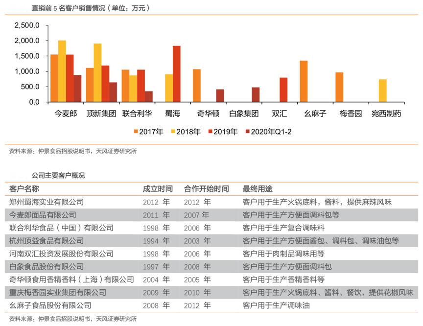 經典案例:根據仲景食品招股說明書、天風證券研究所等綜合資訊表明,仲景食品調味配料通過直銷的模式銷售收入占比約 90%。直銷客戶主要為調味料、方便食品、肉制品、休閑食品的大中型食品生產企業。同時其已經與下游客戶食品制造企業建立了持續穩定的合作關系,今麥郎、頂新集團、聯合利華等較為穩定,前 5 大 客戶收入占總收入比重20%左右。