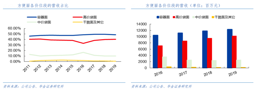 經典案例:根據公司公告、華金證券研究所等綜合資訊表明,截至2019年康師傅方便面銷售量市占率 43.3%,維持第一的市占率水平。從銷售額方面,公司的方便面銷售達到 253 億元,在方便面市場的規模遙遙領先。其中,高端方便面的營收是逐年上升的,其中 2019 年容器面和高價袋面分別實現營收 123 億元和 102 億元,收入占比提升到 89%;中價及中低價方便面的收入占比下降到 11%左右。