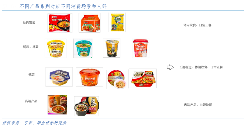 經典案例:根據京東、華金證券研究所等綜合資訊表明,各方便面龍頭廠商通過不斷豐富產品食用方式(泡式、干拌式→煮式和自 熱式)、多樣化產品包裝(袋裝、杯裝、碗裝等)、多樣化的口味(以康師傅為例,方便面有 260 多種不同的口味),橫縱擴寬了消費場景,從主餐替代、休閑零食到主餐化的發展,從藍領到白 領,從低收入人群到中高收入人群,從過去的工地、長途路途的充饑場景,到現在辦公室加班、外出游玩、Party 聚會、游樂園等,隨身攜帶隨時食用。