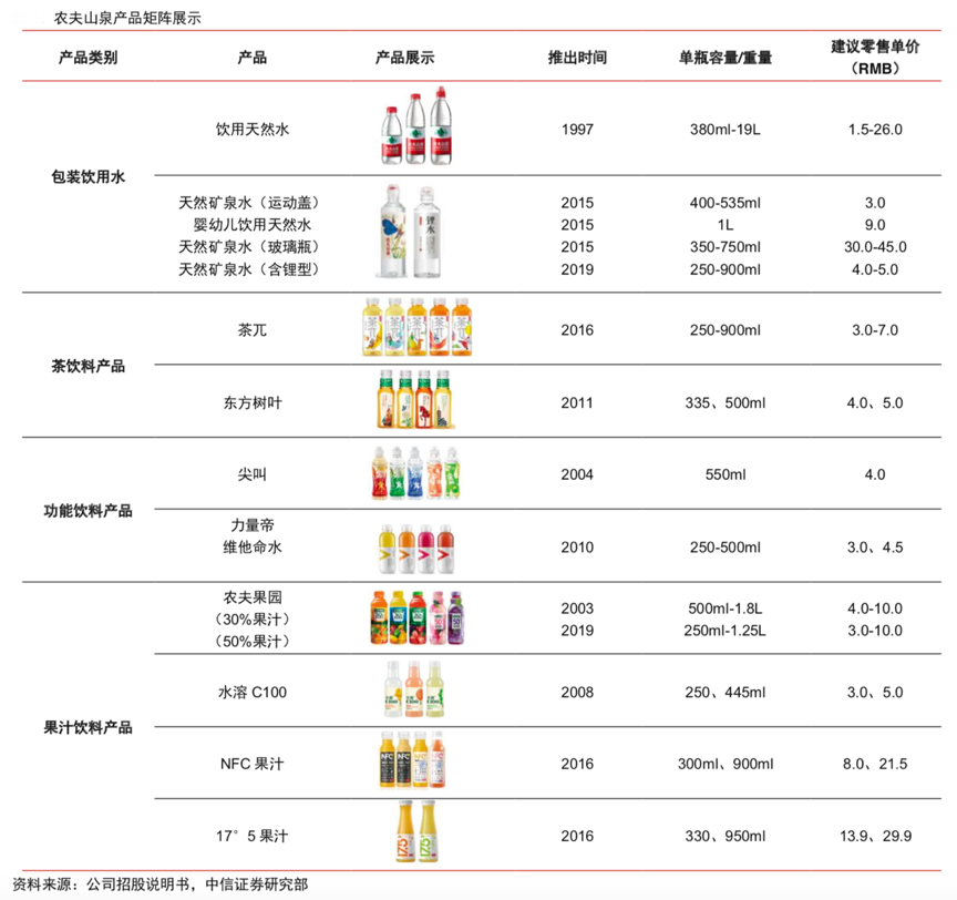 經典案例:根據公司招股說明書、中信證券研究部等綜合資訊表明,農夫山泉秉承“天然、健康”的品牌理念,以包裝飲用水為基本盤,布局果汁飲料、茶飲料等 多個飲料賽道,已經發展成為中國包裝飲用水及飲料行業的龍頭企業。根據弗若斯特沙利 文(轉引自農夫山泉招股書)數據,2012-2019 年,公司包裝飲用水連續八年市占率排名第一,茶飲料、功能飲料、果汁飲料市場份額均位于行業前三名。