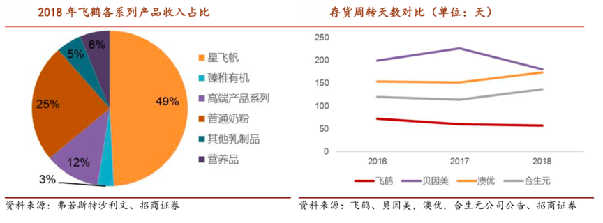 經典案例:根據弗若斯特沙利文、飛鶴、貝因美、澳優、合生元公司公告、招商證券等綜合資訊表明,飛鶴靠大單品、強周轉模式,突圍奶粉行業。其產品中超高端星飛帆占比 50%,高端超高端產品占比 75%,通過高舉高打 的模式實現了快速擴張。飛鶴存貨周轉速度是內資龍頭品牌中最快的,存貨周轉天數最 近三年不斷下降,2018 年僅有 57 天。