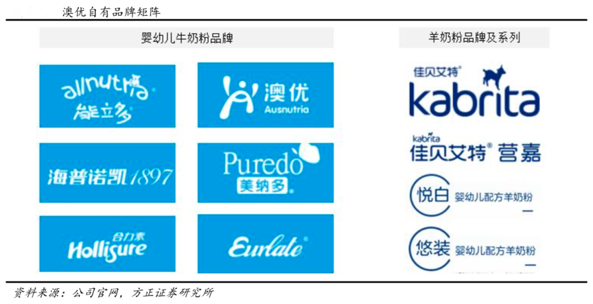 經典案例:根據公司官網、方正證券研究所等綜合資訊表明,澳優從創立以來成功孵化了多個品牌:(1)羊奶粉:公司 2011 年收購荷蘭海普諾凱,成功打造了核心大品 牌羊奶粉“佳貝艾特”,乳源和生產均在荷蘭。(2)牛奶粉:采用多品牌戰略,以品牌為業務單元發展了海普卡諾、 能力多、美納多等事業單元。2019 年佳貝艾特收入規模 29 億元,穩居羊奶粉的第一品牌,根據海關數據在進口羊奶粉總量中佳貝艾特占比高達 61%。