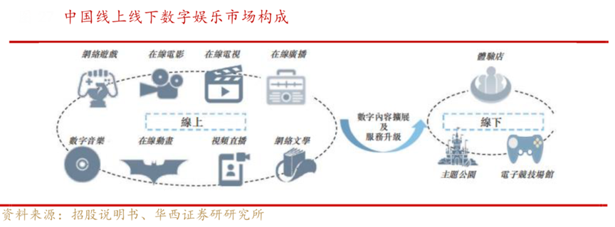 根據騰訊視頻好時光娛樂街區招股說明書、華西證券研究所等綜合資訊表明,中國線上線下數字娛樂市場分為線上、線下兩個部分,線上數字娛樂市場包括網絡游戲、在線電影、在線電視、在線廣播、數字音樂、在線動畫、視頻直播以及網絡文學等數字內容及活動;線下數字娛樂市場作為線上數字娛樂的延伸,其主要形式包括體驗店、主題公園以及電子競技場館。