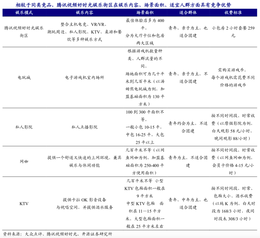 經典案例:根據大眾點評、騰訊視頻好時光、開源證券研究所等綜合資訊表明,相較于電玩城、私人影院、網咖等線下娛樂業態,騰訊視頻好時光娛樂街區競爭優勢突出:1)作為娛樂綜合體,能夠為消費者提供多元化的娛樂 產品,從而提升消費者的消費意愿及 ARPPU。2)能夠通過“騰訊視頻”的品牌效 應進行有效引流,吸引用戶進店體驗。3)深度連接騰訊、索尼和京東等重要股東的 IP 和資源,優質內容供給充足,更新較快,能夠給用戶營造源源不斷的新鮮體驗。4)空間面積較大,產品兼具娛樂性和益智合作性,適合學生進行社團活動、公司進行團建等,并能夠滿足用戶線下社交需求。