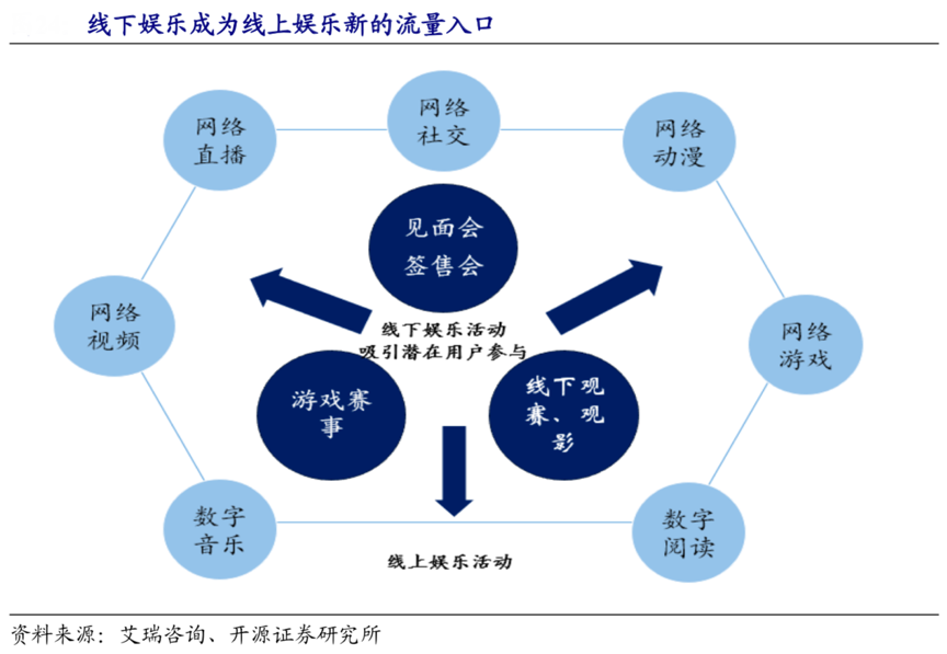 經典案例:根據艾瑞咨詢、開源證券研究所等綜合資訊表明,騰訊視頻好時光娛樂街區依托騰訊視頻好時光線下娛樂渠道和影游 IP 資源,一方面可以舉辦游戲賽事、線下觀賽、粉絲見面會等活動豐富線下娛樂活動,并為創夢天地、騰訊等線上娛樂活動導流,擴大公司游戲用戶量;另一方面可以通過線上休閑游戲內 廣告為線下店宣傳,吸引更多的潛在用戶群體嘗試線下娛樂,線上線下業務流量互通、協同發展。