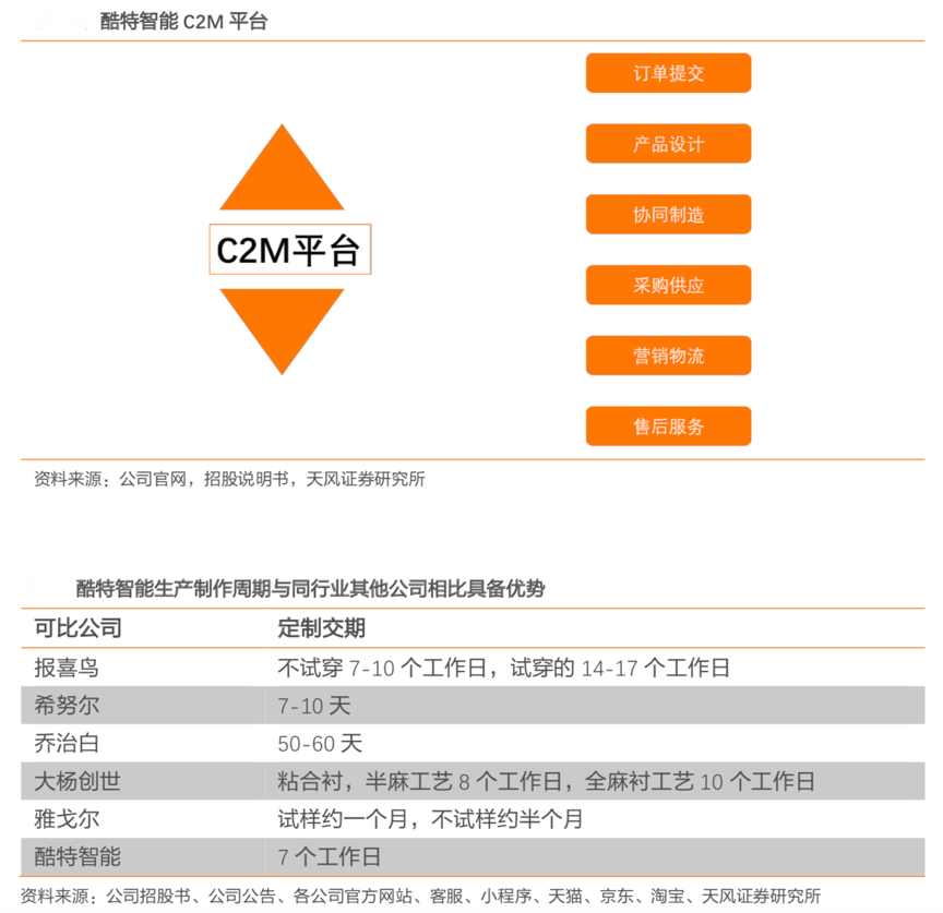 經典案例:根據公司官網、招股說明書、天風證券研究所等綜合資訊表明,酷特通過互聯網將消費者和生產者、設計者等直接連通,個性化定制的服裝 1 件起定制,傳統服裝定制生產周期為 20-50 個工作日,酷特已縮短至 7 個工作日內,其已經具備每年生產 42 萬套定制西服產品、 22 萬件定制襯衫的工業化量產能力。