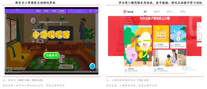 經(jīng)典案例:根據(jù)新東方小學全科公眾號、小猴思維官網(wǎng)、華泰證券研究所等綜合資訊表明,動力因素方面,在線教培機構廣泛借鑒游戲、視頻直播等互聯(lián)網(wǎng)產(chǎn)品的設計來提升學生的興趣。在視覺效果上應用游戲化的 UI 設計、IP 人物設定、動畫、交互式課件、主講教師美顏等手段,提升學生視覺體驗感。在激勵手段上采用升級打怪、學習幣、組隊 PK等方式,提高學生的參與度。