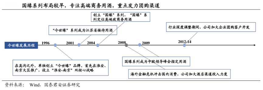經(jīng)典案例:根據(jù)wind、國泰君安證券研究等綜合資訊表明,今世緣最早在 2004 年國 緣上市之初即開始布局淮安及南京市場,國緣系列消費(fèi)群體已以高端商 務(wù)人士為主,經(jīng)年積累之下南京及淮安地區(qū)國緣收入占比高(南京地區(qū)國緣占 比近 6 成,淮安地區(qū)國緣占比近 5 成),故而南京及淮安地區(qū)在團(tuán)購渠 道優(yōu)勢充分。