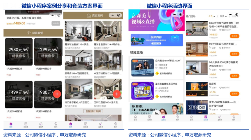 經(jīng)典案例:根據(jù)公司微信小程序、申萬宏源研究等綜合資訊表明,2019 年 12 月,富森美基于微信生態(tài)開發(fā)全新的“富森美在線”小程序,2020年 3 月初小程序上線,線下店鋪入駐達(dá)到 2168 家,線上導(dǎo)購達(dá)到 2.2 萬人。自上線以來到 8 月,僅成都地區(qū)小程序就吸引用戶 80 萬人,實(shí)現(xiàn)訂單近 10 萬筆。