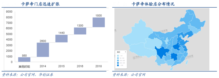 經(jīng)典案例:根據(jù)公司官網(wǎng)、華創(chuàng)證券等綜合資訊表明,結(jié)合年報(bào)披露,自2014年起卡薩帝門店以每年上千家的規(guī)模大力投入,至 2018 年底全國(guó)已高達(dá) 8000 家門店,其中有超 153 家大型體驗(yàn)店、超 81 家創(chuàng)意生 活館及近 600 家成套品牌廳,并在華中、華北、華東等地優(yōu)勢(shì)布局,樹立高端產(chǎn)品形象的同時(shí),也滿足周邊居民對(duì)高端家電的體驗(yàn),進(jìn)而實(shí)現(xiàn)消費(fèi)升級(jí)的覺醒。