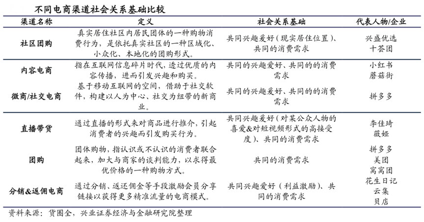 經(jīng)典案例:根據(jù)貨圈全、興業(yè)證券經(jīng)濟與金融研究院等綜合資訊表明,不同營銷方式基于的社會關(guān)系基礎(chǔ)不同,社區(qū)團購本質(zhì)上依靠的是熟人營銷的優(yōu)勢,相對于內(nèi)容營銷與直播營銷來說,顧客天然具有更高的信任度,有利于促進消費行為的發(fā)生。