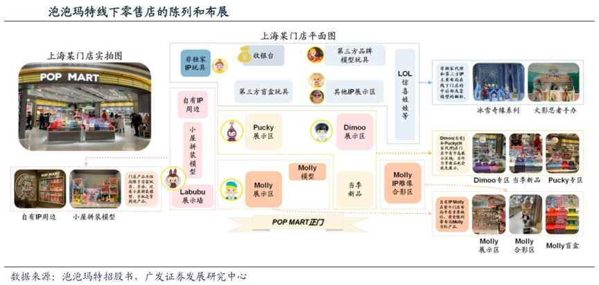 經典案例:根據泡泡瑪特招股書、廣發證券發展研究中心等綜合資訊表明,泡泡瑪特線下實體門店裝修風格潮流,環形設計、玩具展示墻和門口的Molly模型的共同烘托出店面的品牌感,合照區增強了與消費者的互動,快節奏的背景音樂動感旋律與潮玩文化相得益彰。泡泡瑪特的門店客服訓練有素,對產品理解充分,引導顧客完成消費轉化。