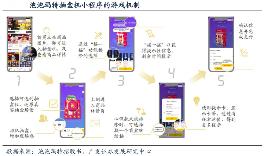 經典案例:根據泡泡瑪特招股書、廣發證券發展研究中心等綜合資訊表明,泡泡瑪特2018年9月推出微信抽盒機,將傳統的商品圖示頁替換成互動玩法抽盒機,用戶可直接從微信小程序中進入選盒界面,下拉則可以瀏覽商品詳情。虛擬抽盒機設置了挑選抽盒位(在一套盲盒中挑選一個)、排隊(多個人同抽一套盲盒時需要排隊)、搖一搖(做初步信息排除) 等以還原真實抽盒場景,另外,為了增加抽盒游戲性,增加了提示卡(增加一條盲盒 商品提示信息)、顯示卡(直接顯示所抽盲盒)等輔助道具,用戶需要完成日常任務獲得功能道具或幸運值,再通過幸運值兌換相關卡券。由于抽盒機游戲道具設置,以及線上換盒的便利性,更容易引發用戶為獲得高價值“隱藏款”的消費沖動,提升復購率。