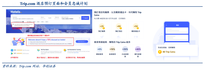 經(jīng)典案例:根據(jù)Trip.com網(wǎng)站、華創(chuàng)證券等綜合資訊表明,Trip.com價(jià)格上提供最惠保障,提供積分獎(jiǎng)勵(lì)用以加強(qiáng)用戶粘性。同時(shí)平臺(tái)為加強(qiáng)用戶粘性和讓利消費(fèi)者,除享有對(duì)應(yīng)會(huì)員等級(jí)的折扣外,另提供積分抵扣訂單金額計(jì)劃, 100 trip coin=1USD,會(huì)員等級(jí)越高獲取積分比例越高。