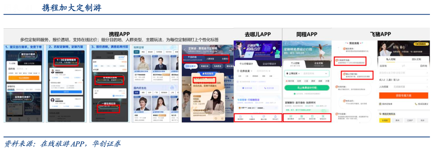 經(jīng)典案例:根據(jù)在線旅游APP、華創(chuàng)證券等綜合資訊表明,2023年攜程私家團(tuán) GMV 同比 2019 年增長(zhǎng) 370%,其中 2~9 人的小團(tuán) GMV 同比 2019 年增長(zhǎng) 100%。相比較下,攜程定制游產(chǎn)品相較其他平臺(tái)更為個(gè)性化和人性化,依 托完整的大交通和大住宿的旅游生態(tài)圈,定制產(chǎn)品有更為明顯的優(yōu)勢(shì)。