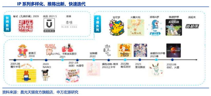 經(jīng)典案例:根據(jù)公司公告、公司官網(wǎng)、申萬(wàn)宏源研究等綜合資訊表明,晨光股份公司以學(xué)生文具品類為主,2023 年上新節(jié)奏由 2 次調(diào)整為 4 次,助力提升新品存活率;結(jié)合公司層面零售運(yùn)營(yíng)能力,公司通過對(duì)全國(guó)訂單和數(shù)據(jù)分析,篩選優(yōu)勢(shì)品類和 SKU,輸出更精準(zhǔn)、有效的產(chǎn)品配置標(biāo)準(zhǔn),賦能和指導(dǎo)經(jīng)銷體系及終端產(chǎn)品上架。