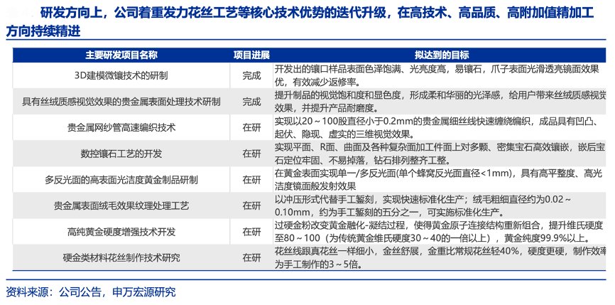 經典案例:根據公司公告、申萬宏源研究等綜合資訊表明,2023年潮宏基公司研發費用為 0.63 億元,研發方向上,公司著重發力花絲工藝等核心技術優勢的迭代升級,在高技術、高品質、高附加值精加工方向持續精進,保持產品和工藝的獨特性,構建差異化的競爭力。