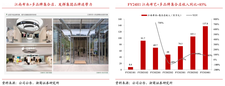 經典案例:根據公司公告、浙商證券研究所等綜合資訊表明,江南布衣公司推出江南布衣+多品牌集合店等新興消費場景和產品,通過“不止盒子私人搭配”、“跨品牌會員權益”、“免運費寄送”、“服裝高端洗護”等會員專屬體驗的消費場景,加強粉絲粘性。FY2023H2、FY2024H1 江南布衣+集合店收入同比分別+119%、+85%至 1.05、 1.38 億元,彰顯集團品牌連帶力與新渠道的快速增長。