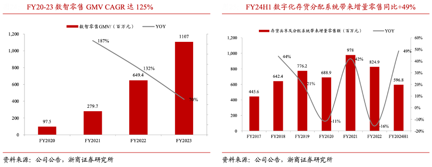 經典案例:根據公司公告、浙商證券研究所等綜合資訊表明,江南布衣公司充分運用互聯網+,強化國內外各類零售網絡精細化運營,加強私域運營深度與消費者黏性,同時通過精細化庫存管理賦能銷售。FY2020-2023 年數智零售 GMV 年化復合增長 125%至 11.1 億元, FY2024H1 數字化存貨分配系統帶來的增量零售同比+49%至 6.0 億元。